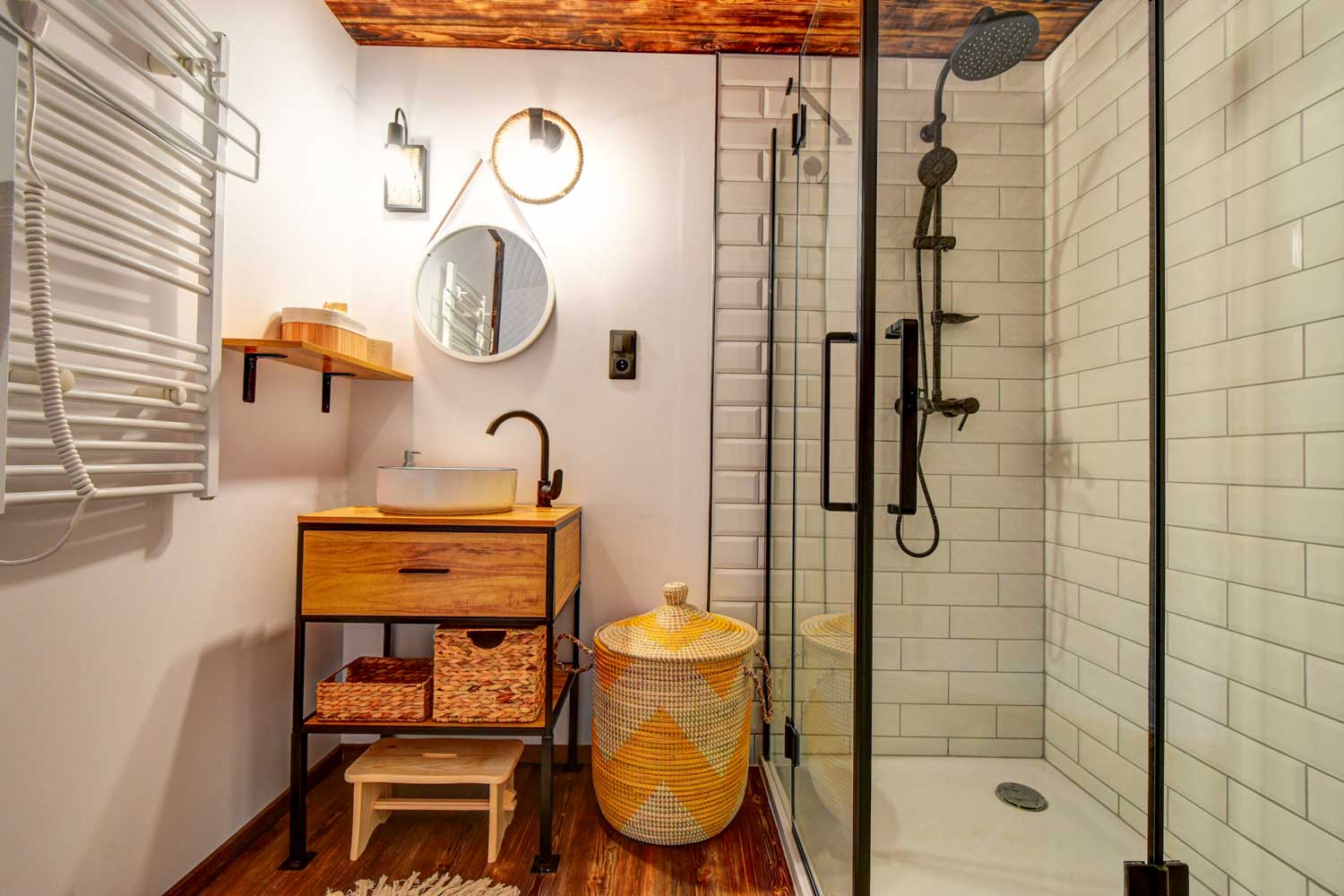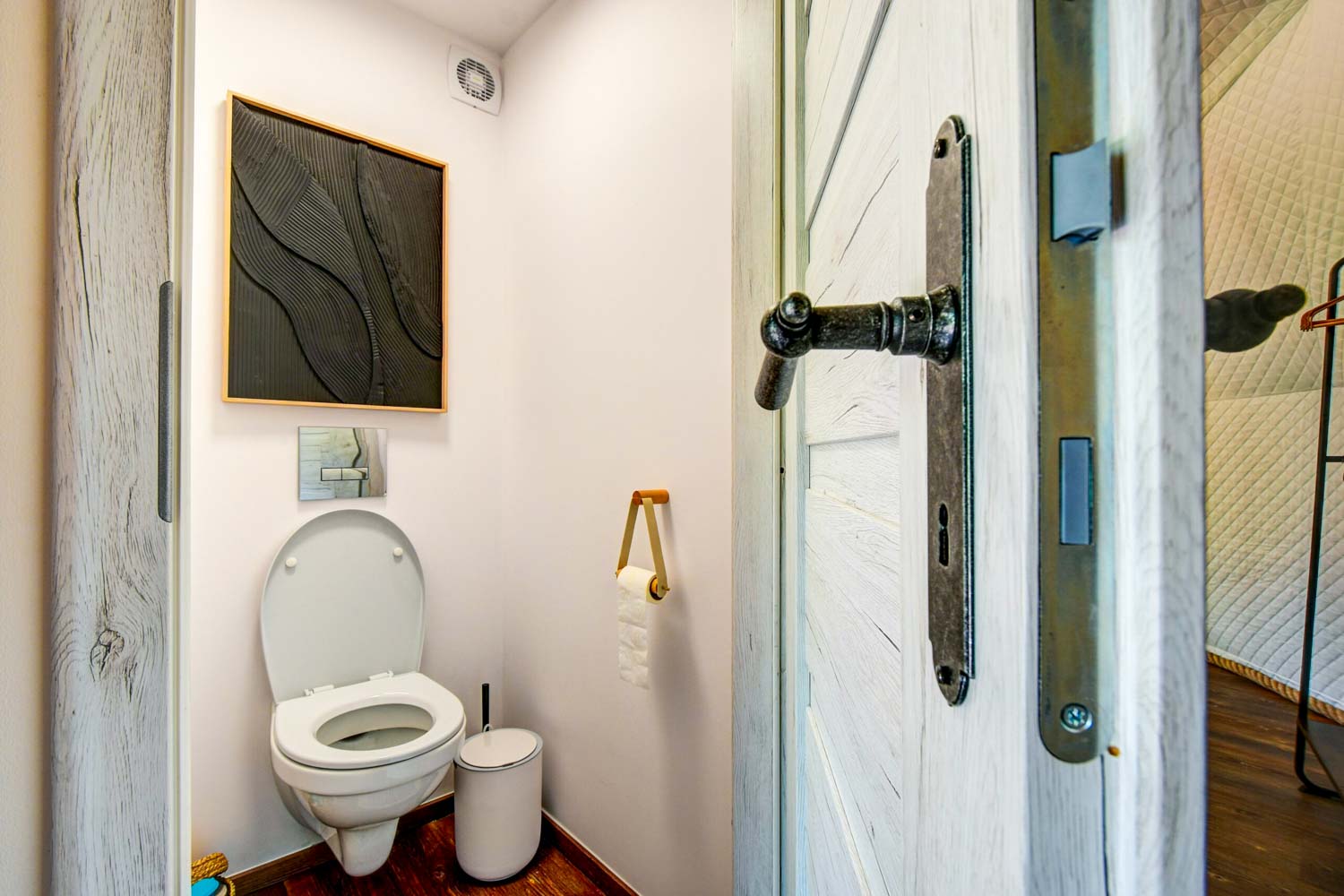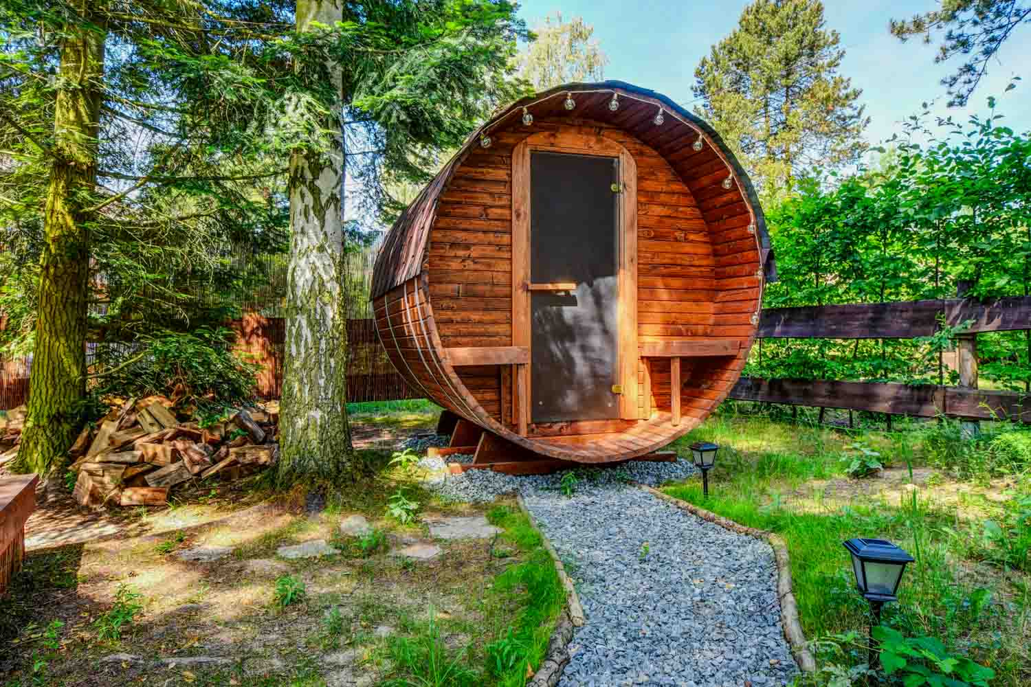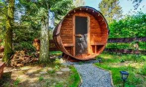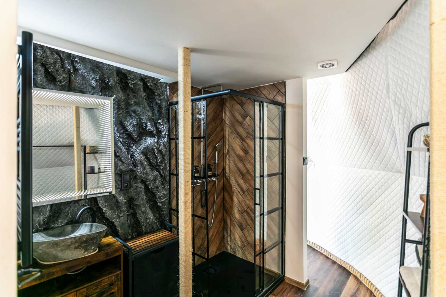 K dispozici je také koupelna se sprchovým koutem, toaletou, umyvadlem a zrcadlem. Stejně jako u prvního stanu nechybí venkovní část – slunečná terasa s posezením, vířivkou a grilem a samostatné ohniště s posezením, které doplňuje celkový komfort pobytu.