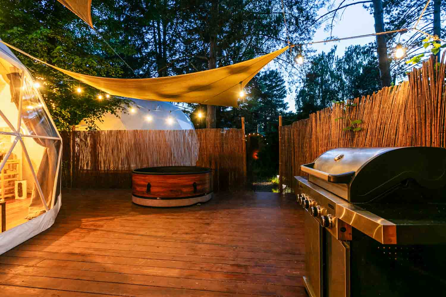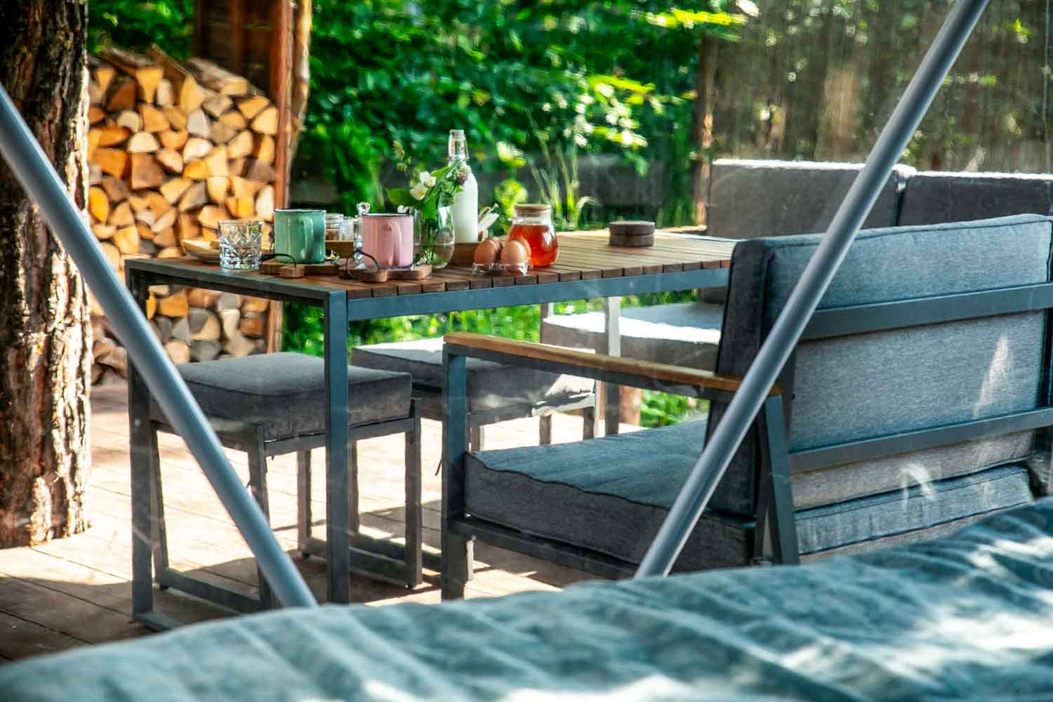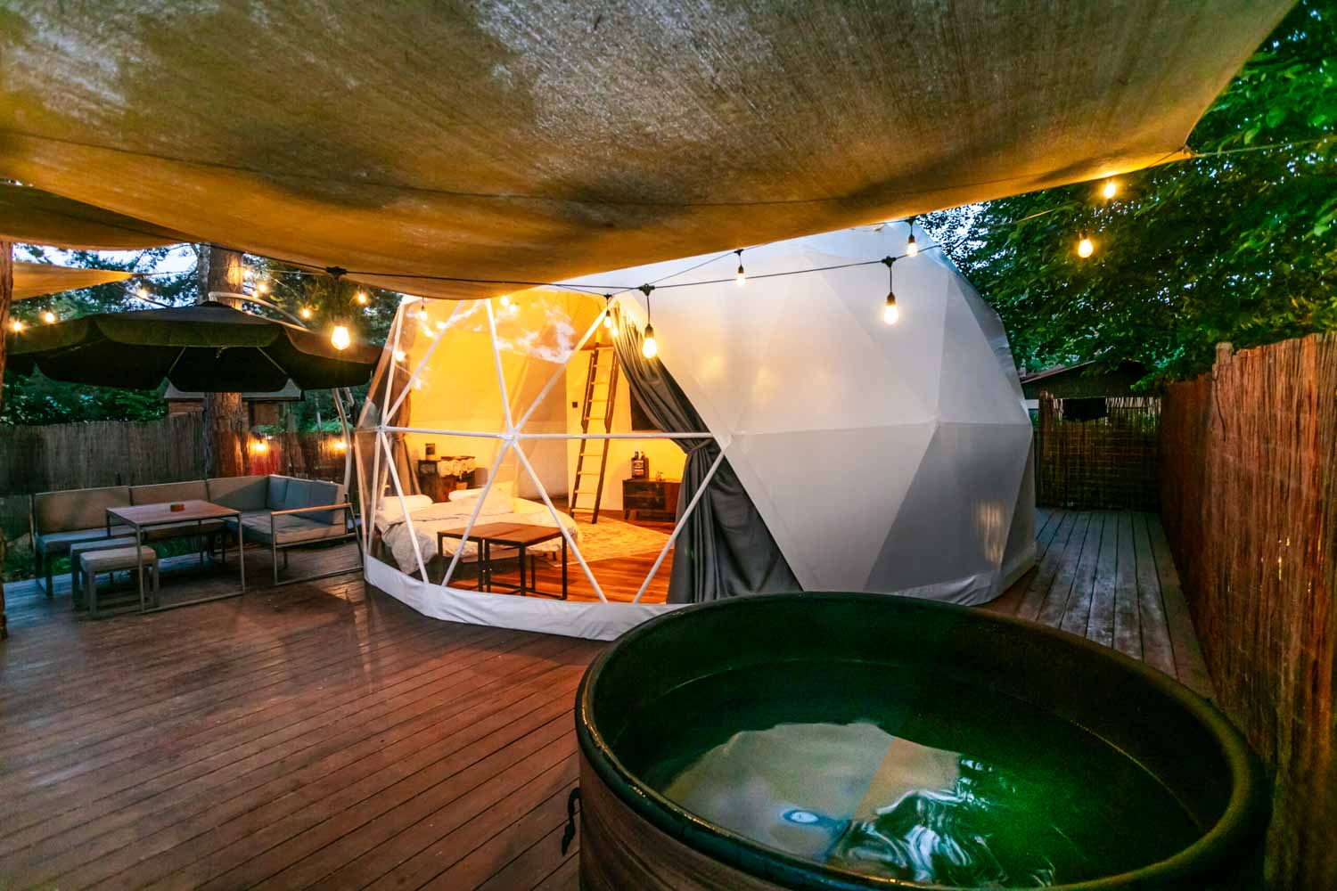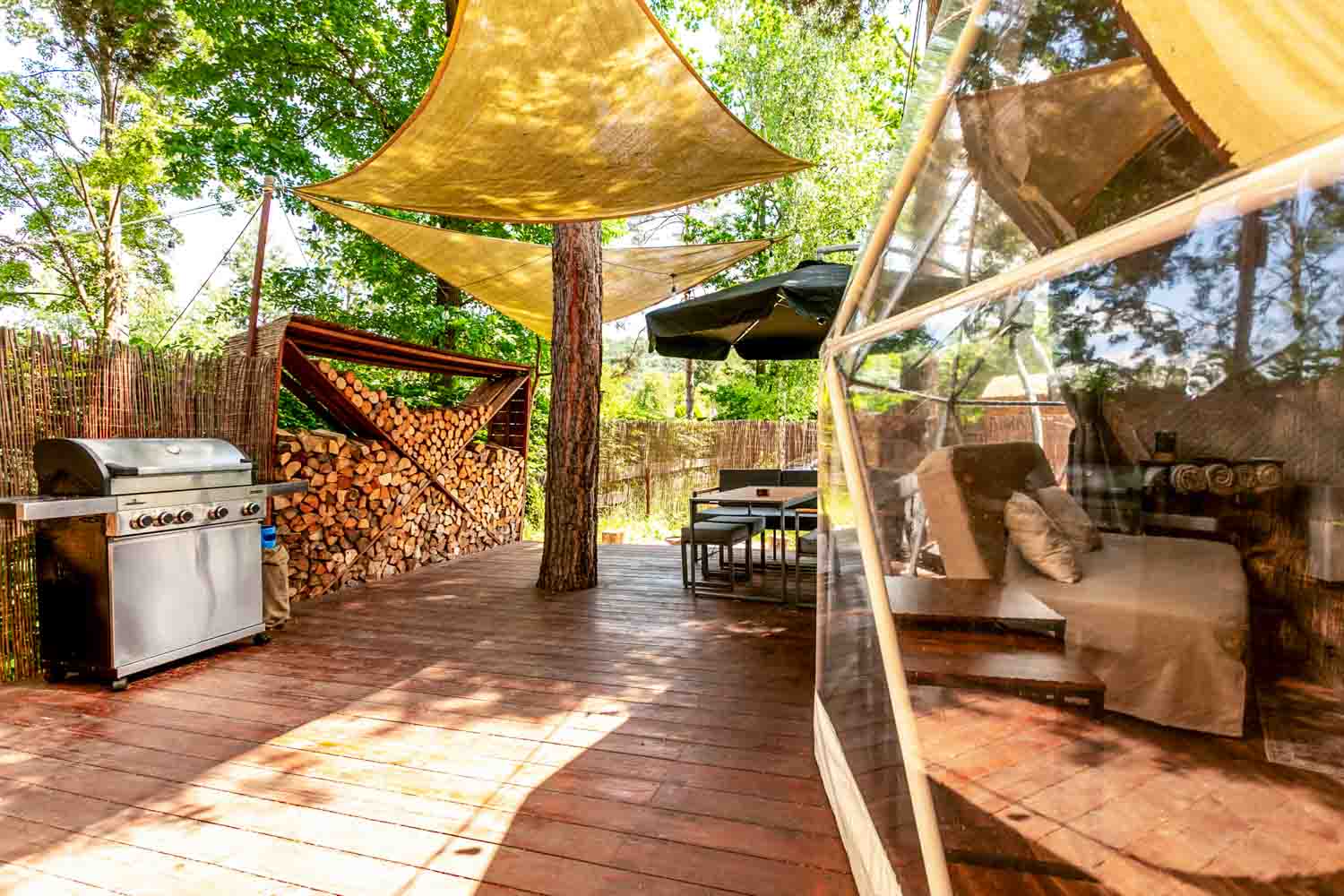 Součástí stanu je také koupelna se sprchovým koutem, umyvadlem a zrcadlem, přičemž toaleta je řešena samostatně. Velkou předností je venkovní zázemí – slunečná terasa s posezením, grilem a vířivkou, která nabízí prostor pro odpočinek, a dále ohniště s posezením pro večerní posezení.