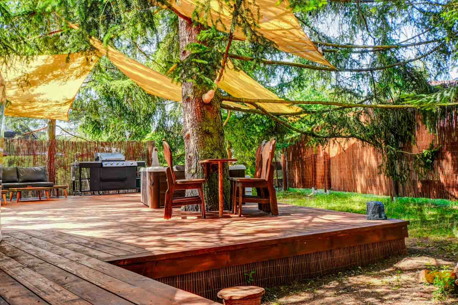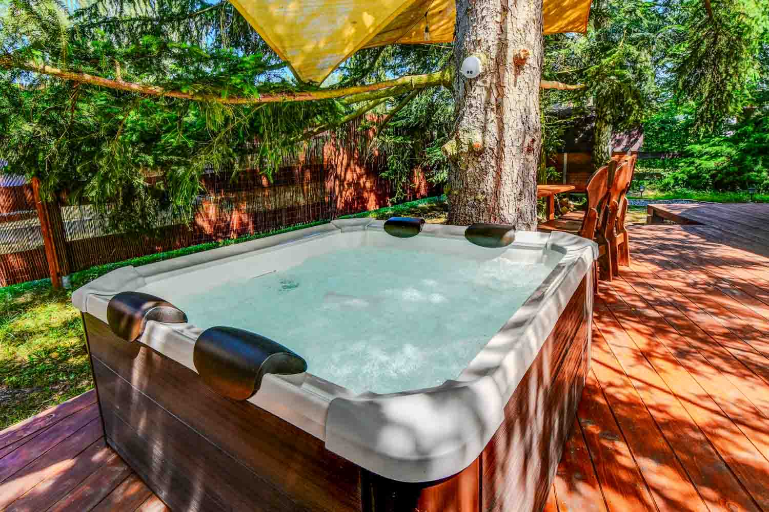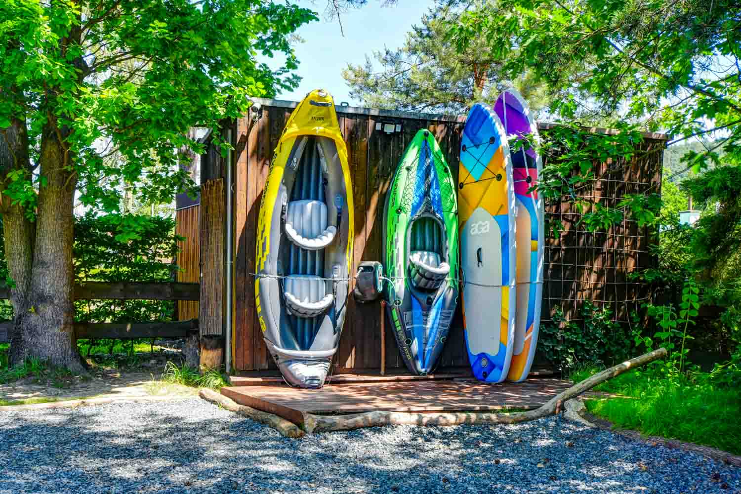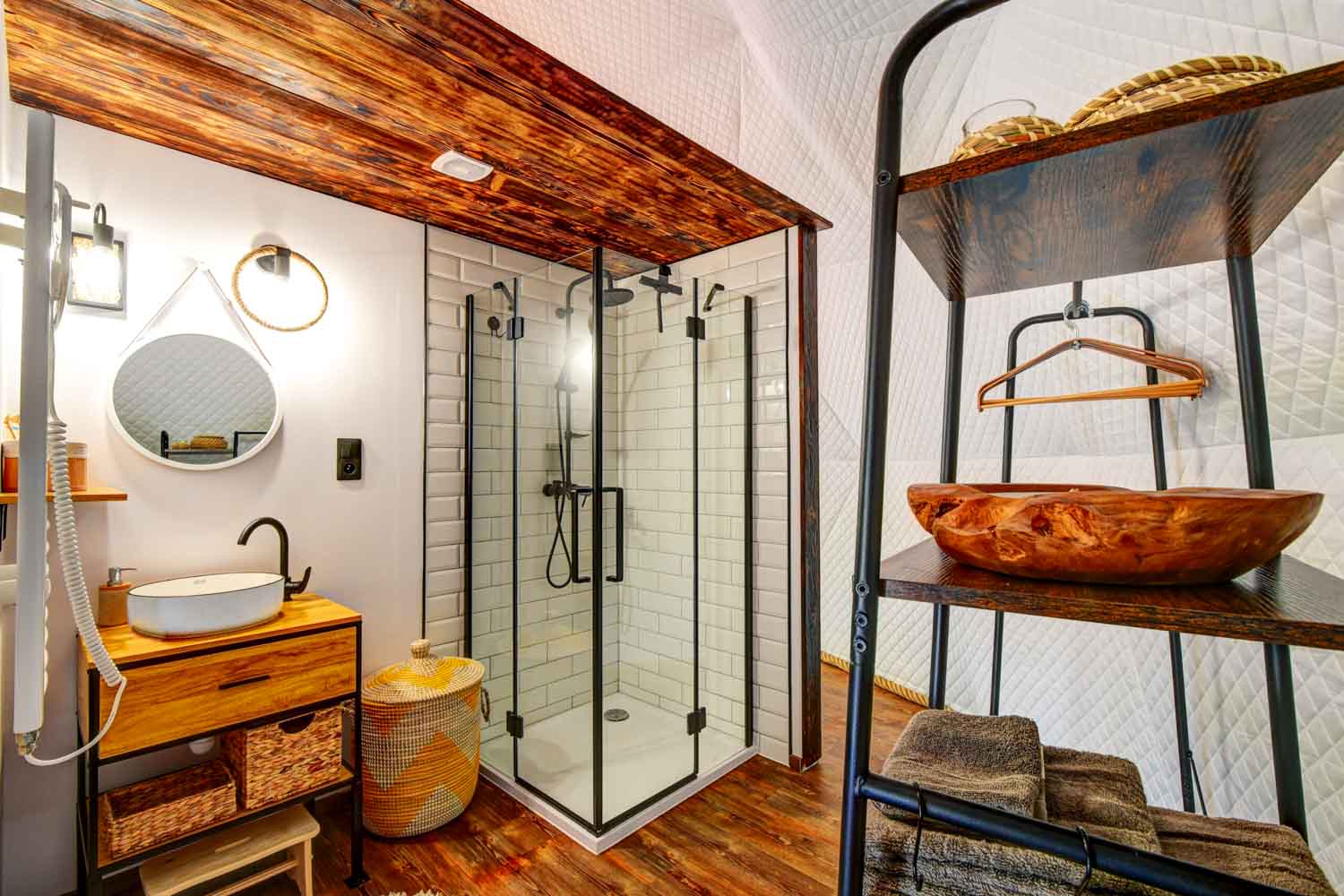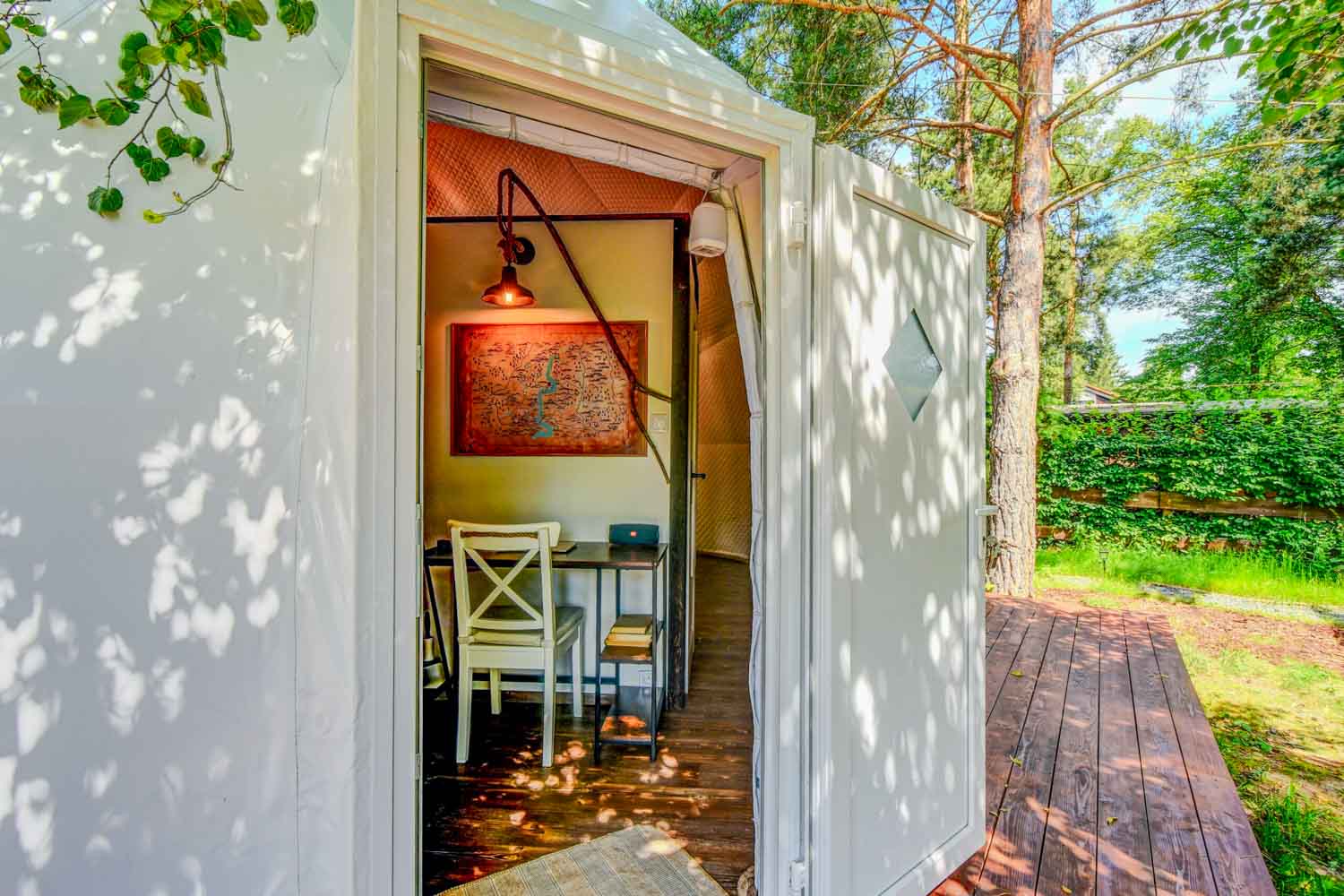 Součástí stanu je také koupelna se sprchovým koutem, umyvadlem a zrcadlem, přičemž toaleta je řešena samostatně. Velkou předností je venkovní zázemí – slunečná terasa s posezením, grilem a vířivkou, která nabízí prostor pro odpočinek, a dále ohniště s posezením pro večerní posezení.