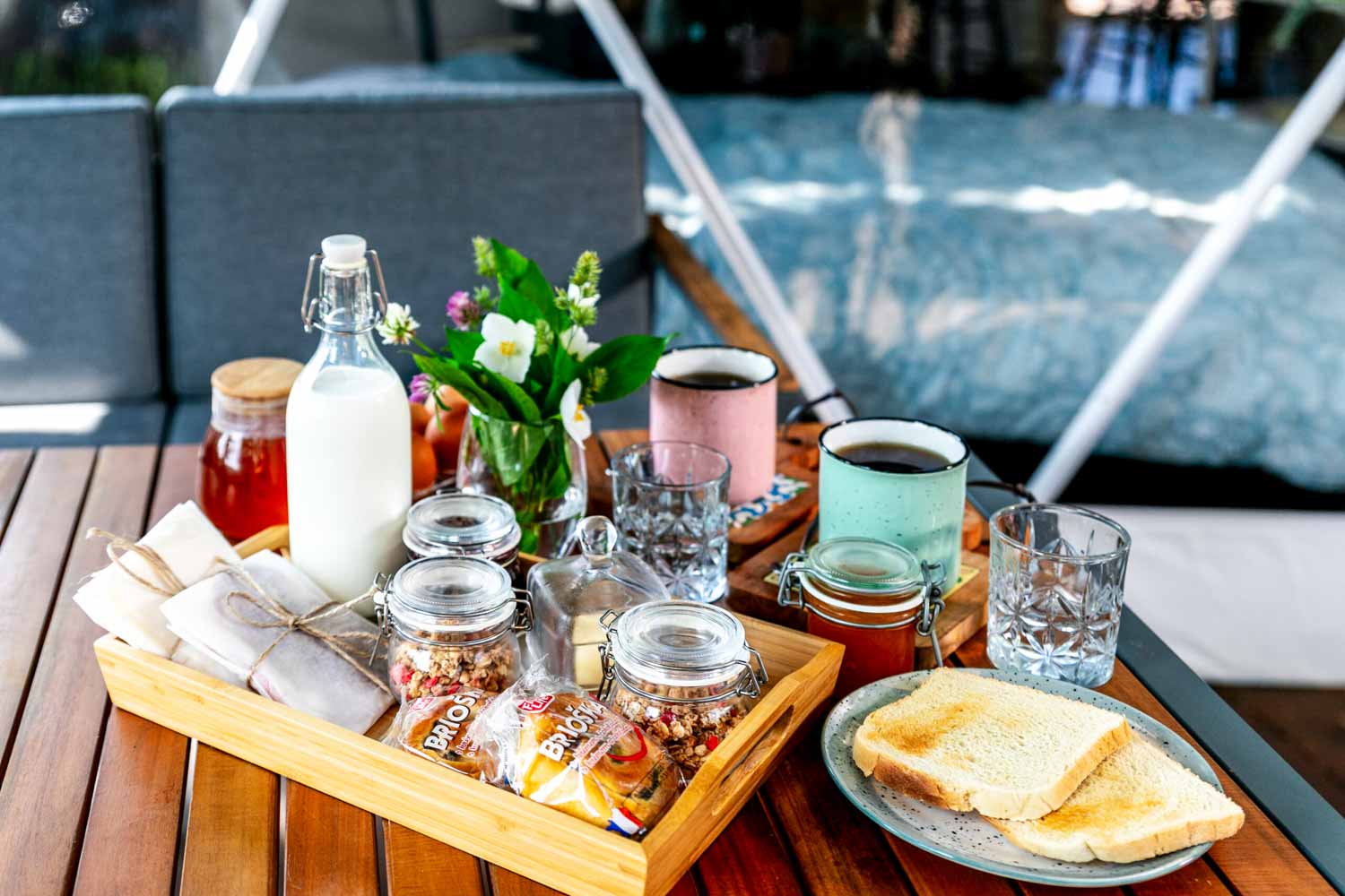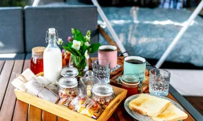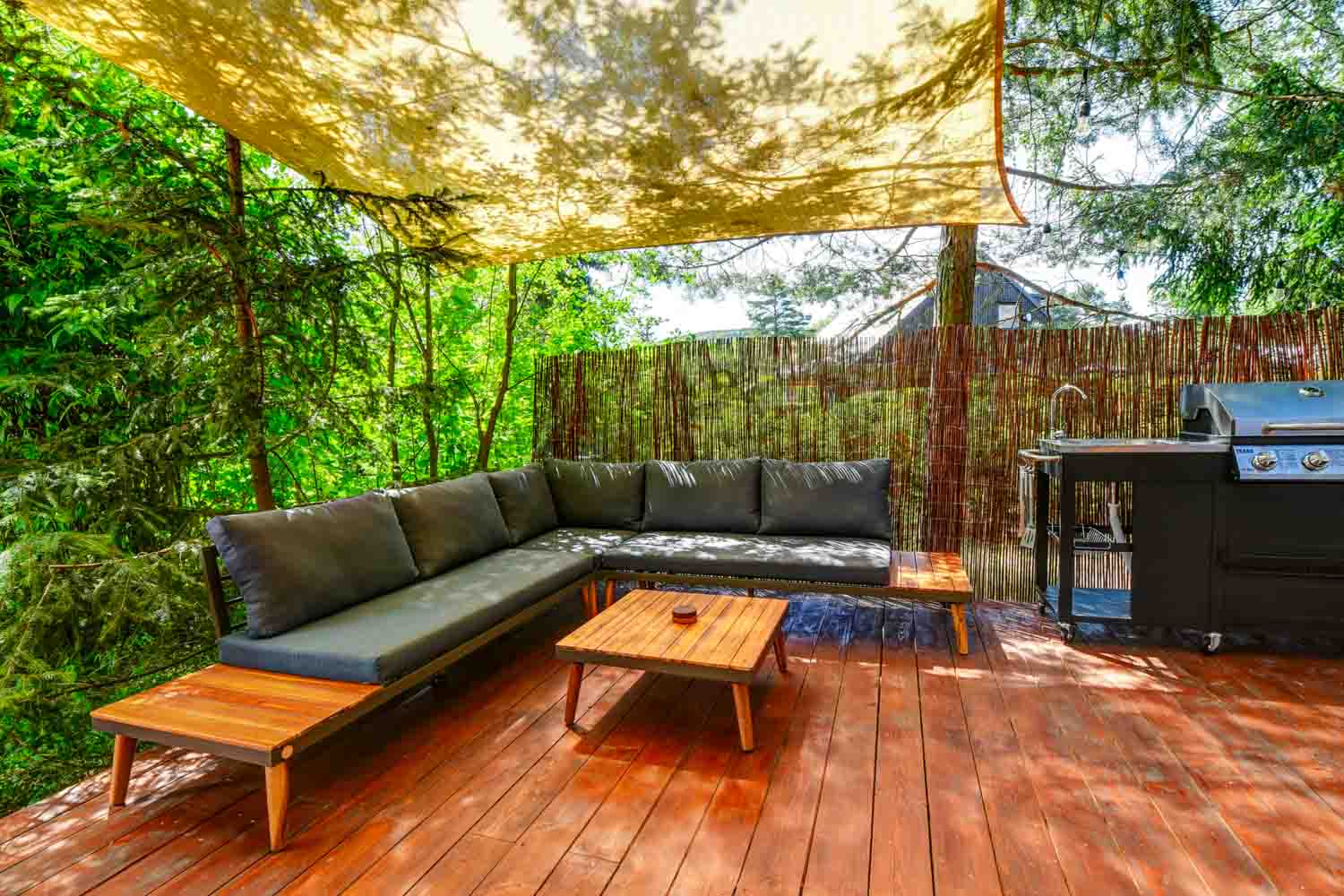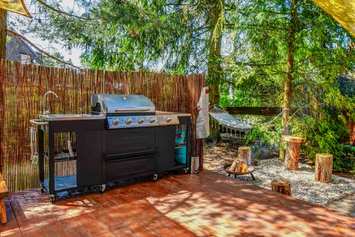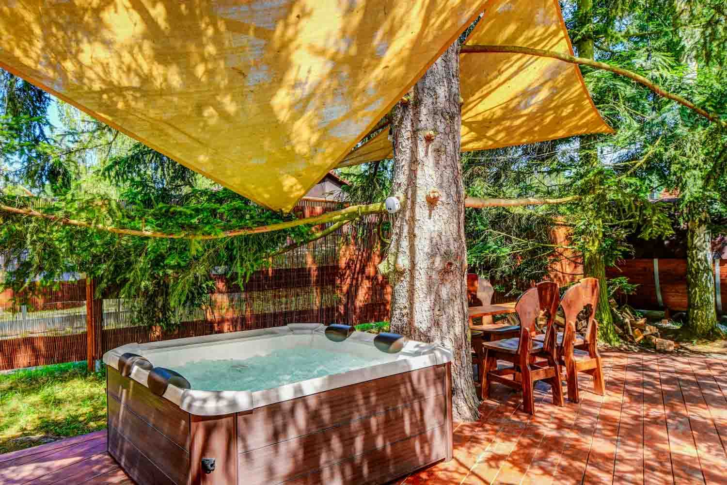 Součástí stanu je také koupelna se sprchovým koutem, umyvadlem a zrcadlem, přičemž toaleta je řešena samostatně. Velkou předností je venkovní zázemí – slunečná terasa s posezením, grilem a vířivkou, která nabízí prostor pro odpočinek, a dále ohniště s posezením pro večerní posezení.