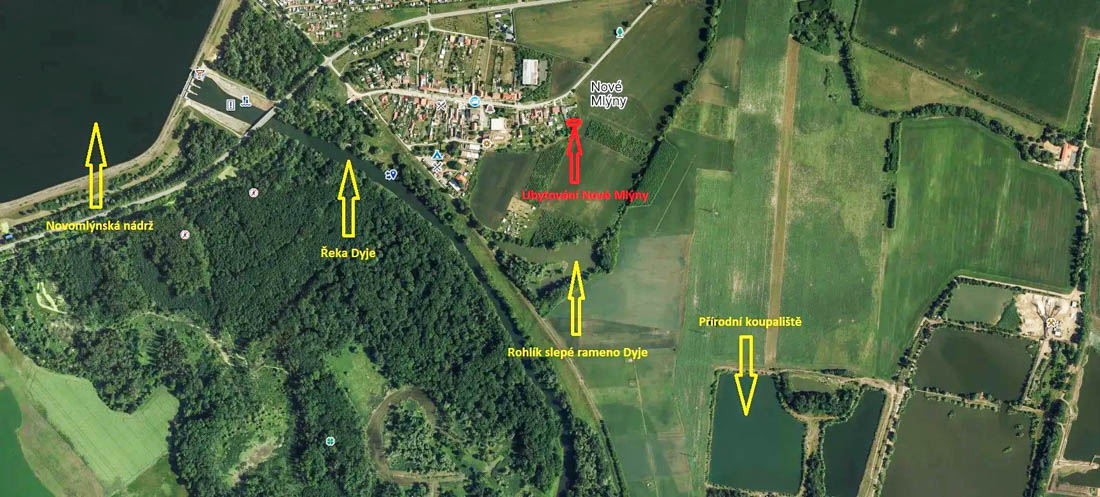 Ubytování najdete v obci Nové Mlýny, které se nachází v atraktivní lokalitě poblíž CHKO Pálava a Novomlýnských nádrží. Tato oblast je oblíbená mezi turisty, kteří sem míří za pěší turistikou, cykloturistikou či poznáváním místních vinných sklípků v Mikulově, Pavlově a okolí. Pokud jste milovníkem vodních sportů, přijdete si také na své, neboť Novomlýnská nádrž nabízí možnosti windsurfingu, kiteboardingu nebo jachtingu. V sezóně je možné si zapůjčit vybavení nebo se zúčastnit kurzů pod vedením zkušených instruktorů. Rybáři ocení bohaté možnosti rybolovu na přehradě i řece Dyji.