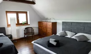 Další volbou je nový apartmán pro čtyři až šest osob, který je umístěn přímo ve vinařství. Má vlastní plně vybavenou obytnou kuchyni (lednice, sklokeramická deska, mikrovlnná trouba, rychlovarná konvice, kuchyňské náčiní a nádobí). Je zde i jídelní stůl a židle. Vhodný je i pro rodiny s dětmi. Má dvě samostatné ložnice, v každé z nich je dvoulůžko a jedna přistýlka. Z apartmánu můžete vyjít na terasu s posezením, která nabízí nádherný výhled na Pálavu, její hrady, jezera a okolní krajinu. Připojení k WIFI je zde k dispozici.