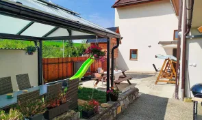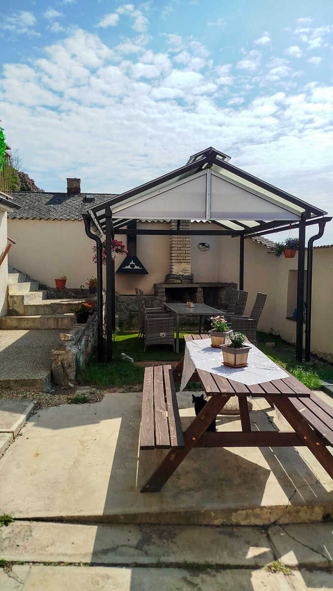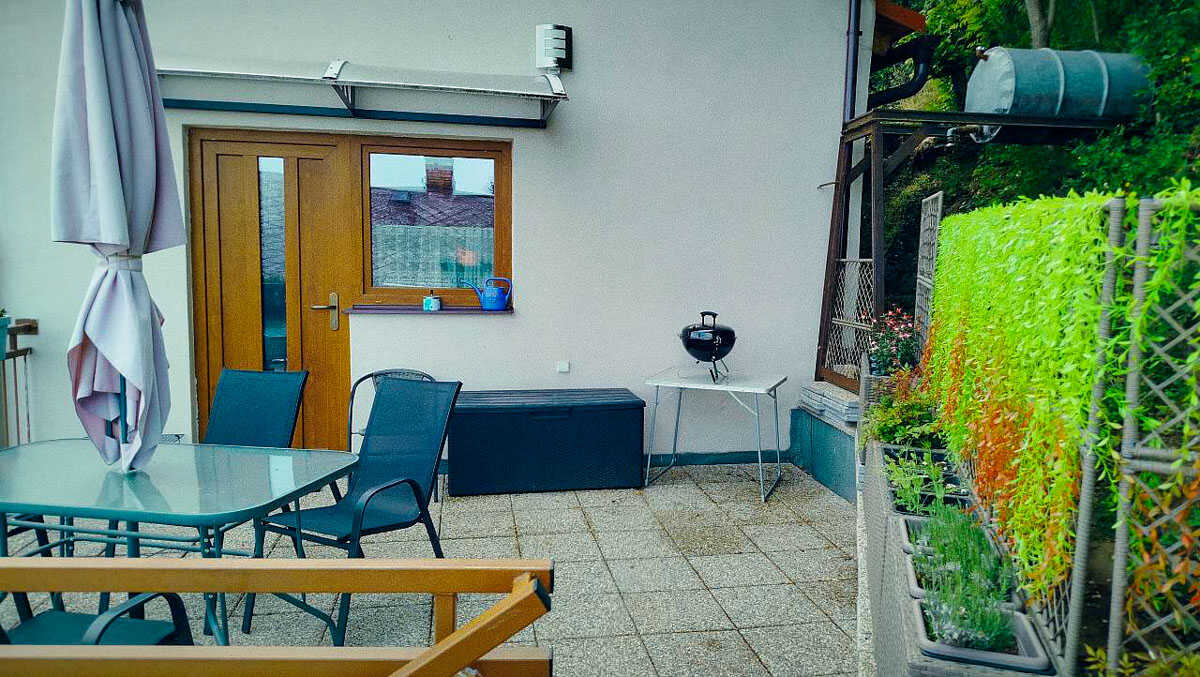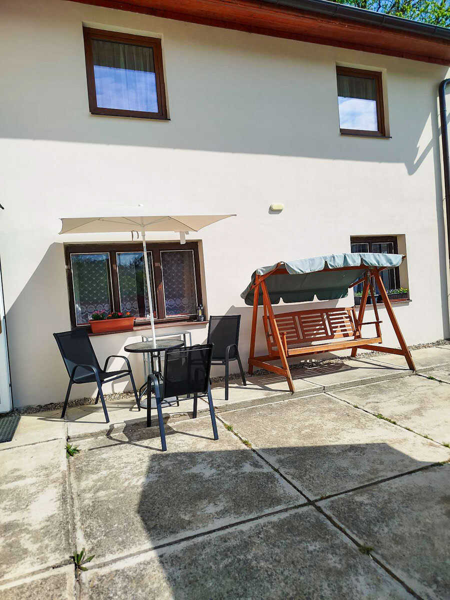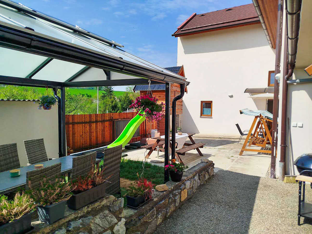 Venku na uzavřeném dvoře si hosté mohou vychutnat venkovní posezení pod pergolou, využít zděný gril, ohniště i mobilní barbecue gril. Děti potěší zahradní houpačka a domeček se skluzavkou. Samozřejmostí je prostor pro uschování kol a parkování přímo u objektu.