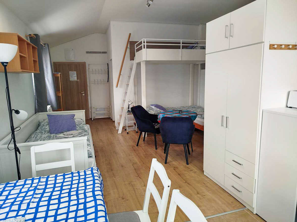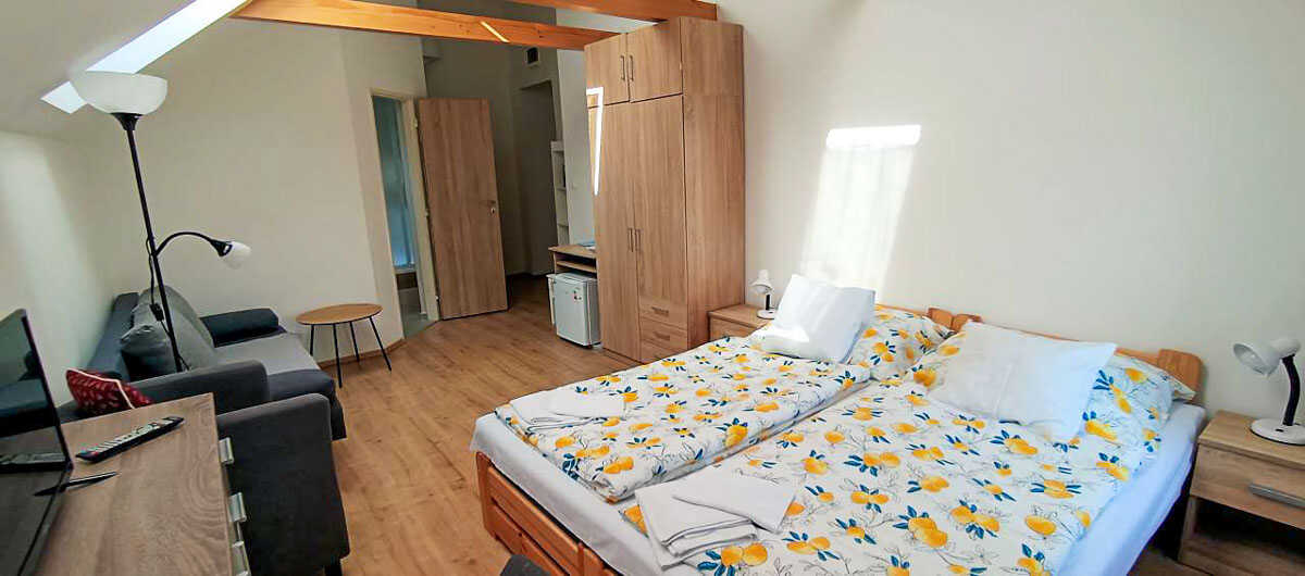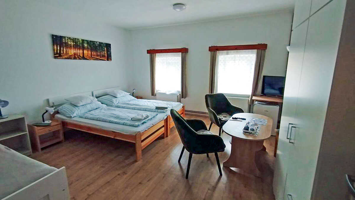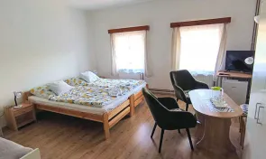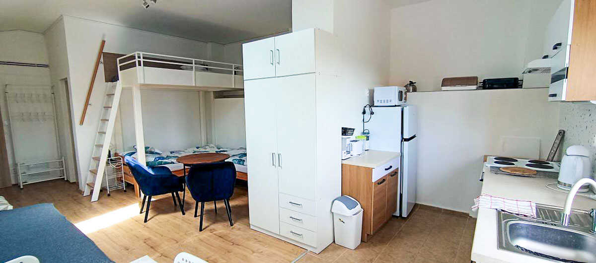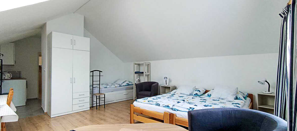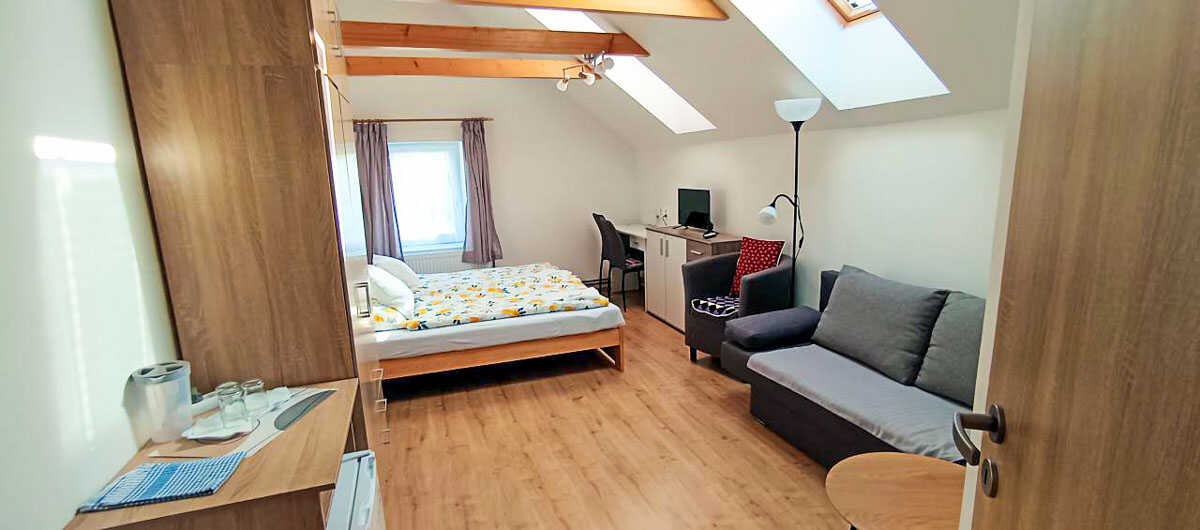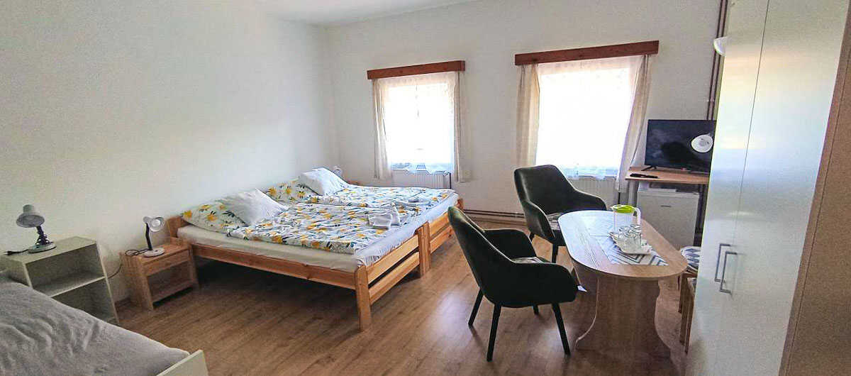 Hosté si mohou vybrat mezi studii s kuchyňkou a terasou nebo prostornými pokoji s chladničkou a pohodlným posezením. Pokoj č. 1 je útulné studio s plně vybavenou kuchyní (elektrický sporák, lednice s mrazákem, kávovar, mikrovlnka, toustovač) a terasou s posezením, kam lze vstoupit i samostatně zvenčí. Pokoj č. 2 nabízí dvě lůžka a rozkládací pohovku s přistýlkou, Pokoj č. 3 disponuje manželskou postelí a pohovkou, zatímco Pokoj č. 4 je podkrovní studio s vlastním kuchyňským koutem, troubou a velkým rozkládacím křeslem – ideální pro rodiny či menší skupiny.