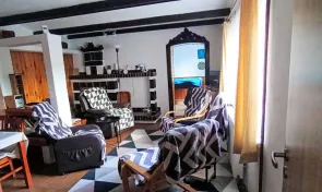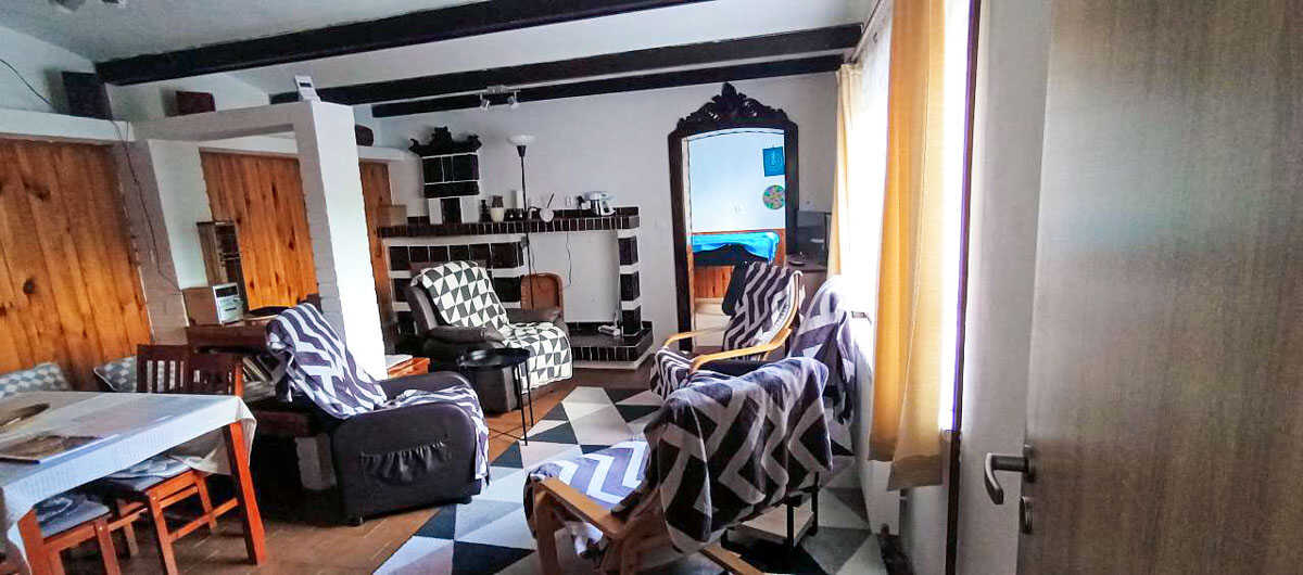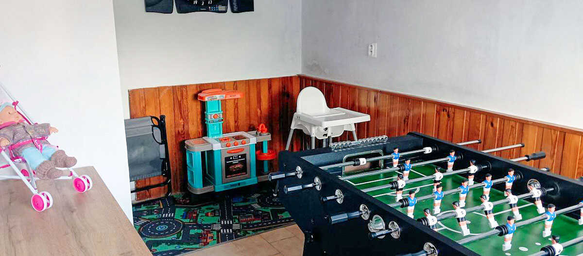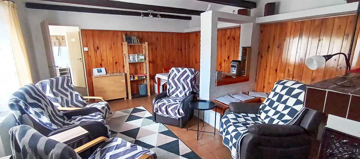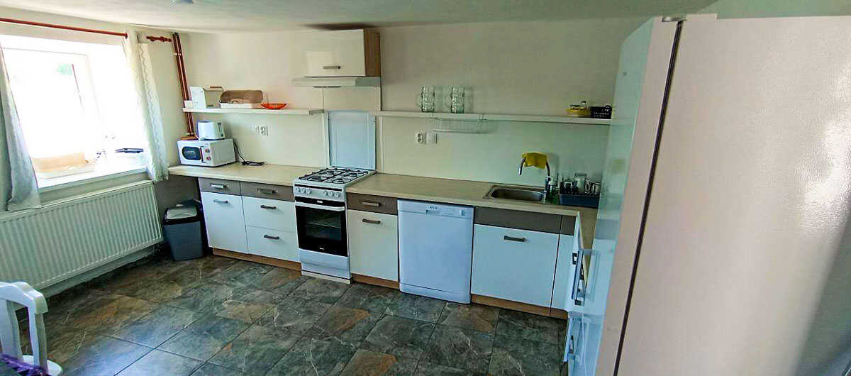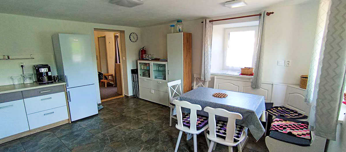 V přízemí se nachází společná kuchyně (myčka, pračka, kávovar, lednice, mrazák, sporák, mikrovlnka) a společenská místnost s krbem, pohodlnými křesly a televizí, která slouží jako srdce penzionu. Pro děti je připravena herna se stolním fotbalem, šipkami, hračkami i dětskou kuchyňkou.