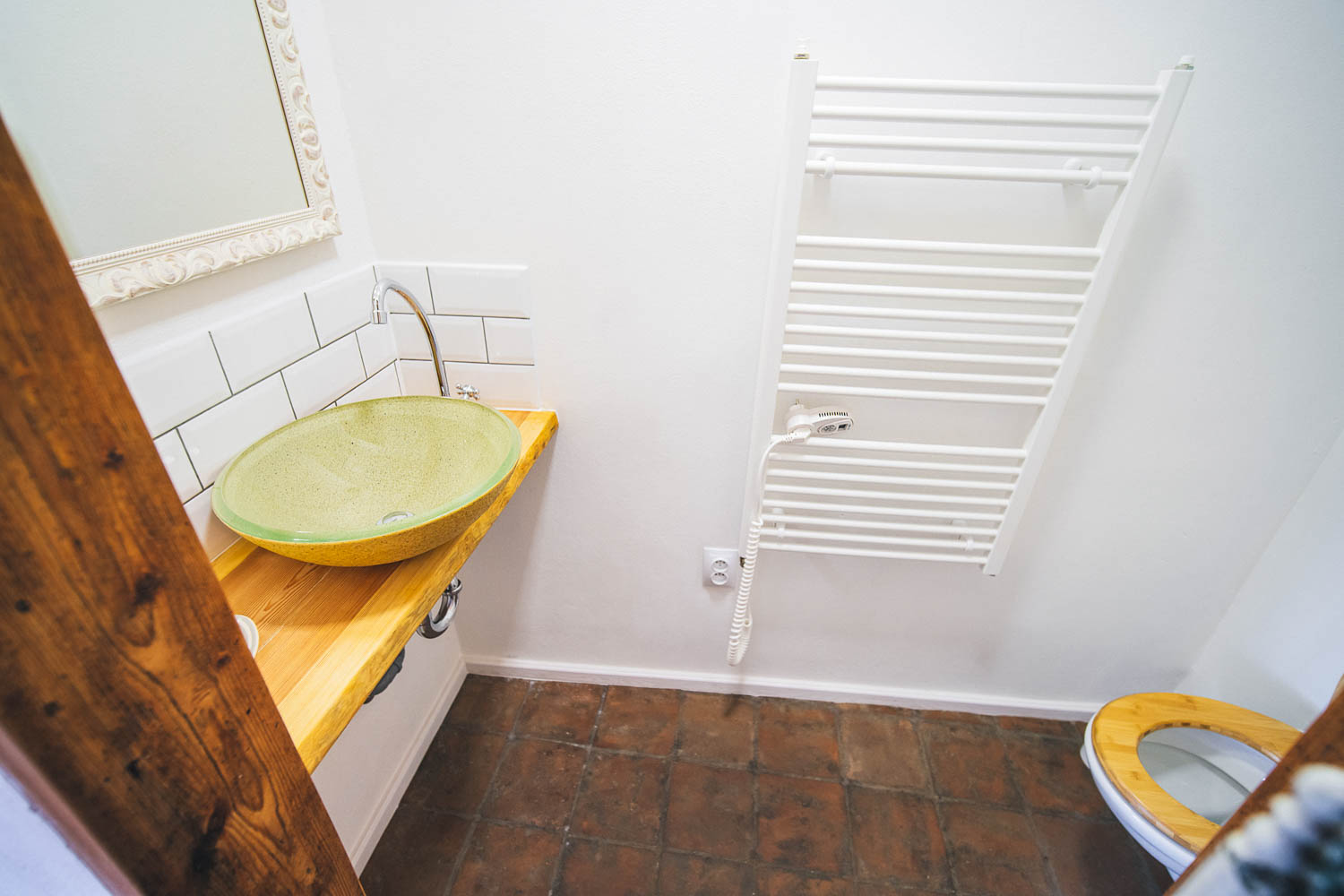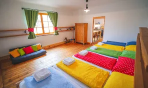 Větší apartmán (6 lůžek + 2 přistýlky) tvoří jedna velká společná ložnice, kuchyně s velkým jídelním stolem pro 11 osob, koupelna a dvě toalety. Přistýlky jsou řešené formou rozkládacího futonu a v apartmánu je i dětský koutek. Kuchyň je vybavena lednicí bez mrazáku, rychlovarnou konvicí, mikrovlnkou, topinkovačem, vařičem vajec, sklokeramickým vařičem (2 plotýnky), digestoří, dřezem a nádobím, nechybí ani french press a elektrický mlýnek na kávu. Koupelna má sprchový kout, umyvadlo a toaletu, druhá toaleta je samostatná s malým umyvadlem.