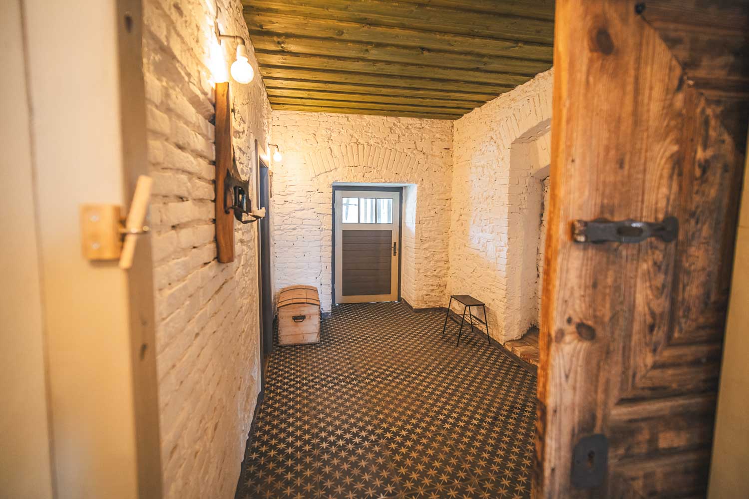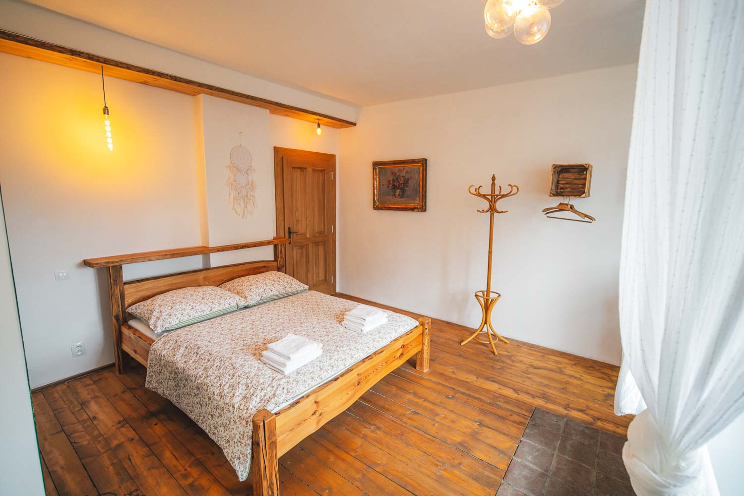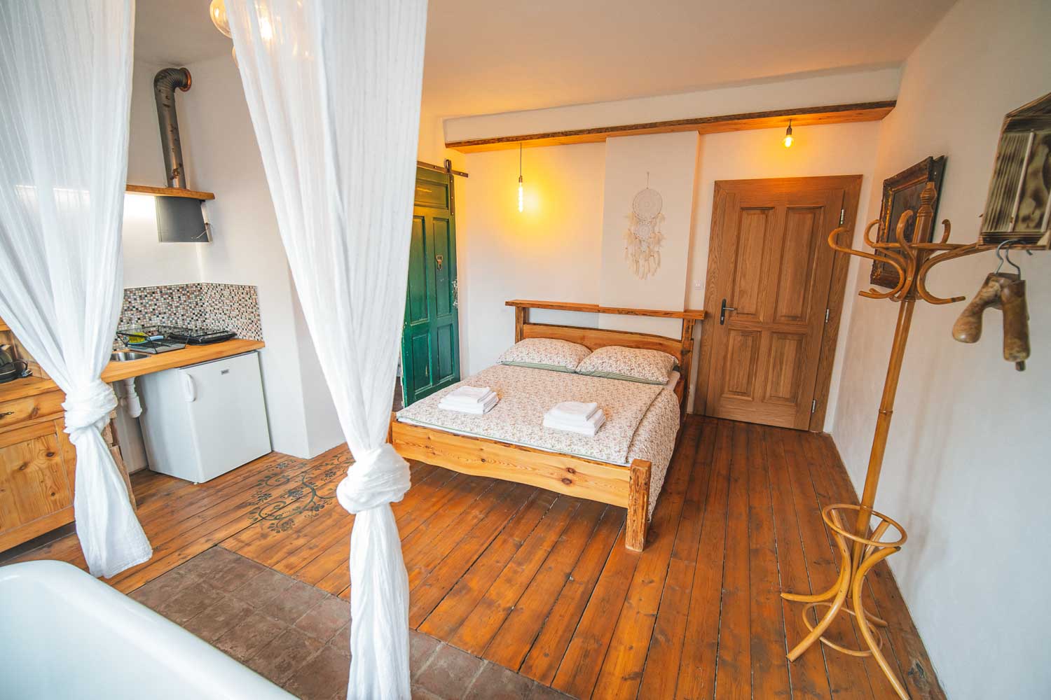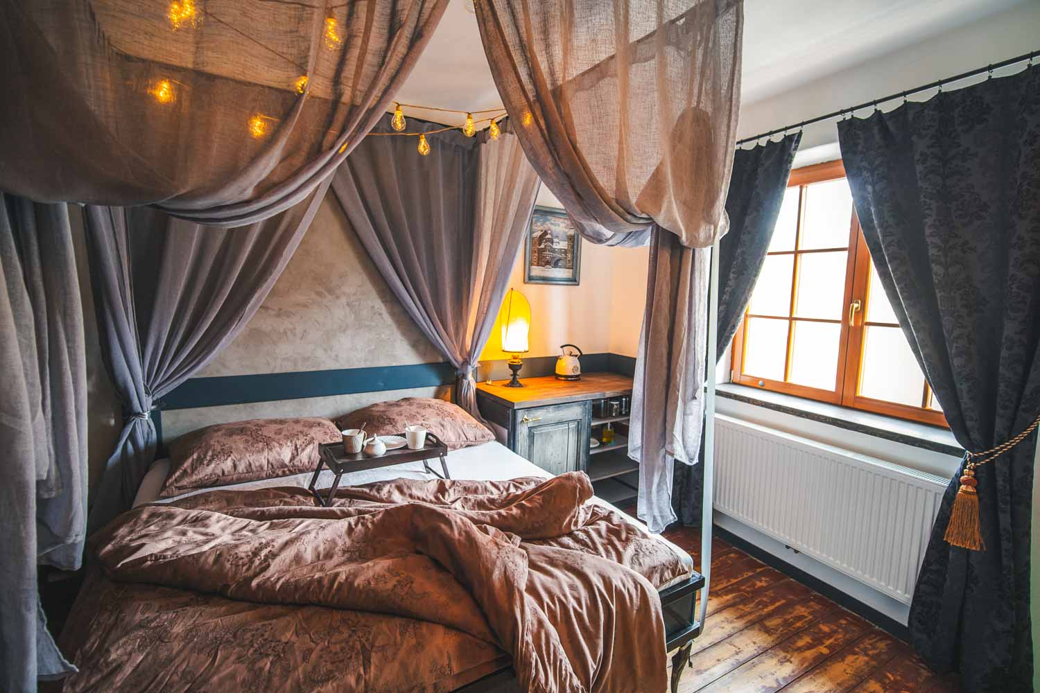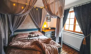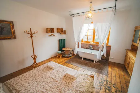 Romantický pokoj je dvoulůžkový a nabízí manželskou postel, vlastní kuchyňku a výjimečný prvek v podobě vany u okna s výhledem na tvrz (pěna a sůl do koupele jsou v ceně). Součástí je oddělená toaleta s umyvadlem a praktické úložné prostory. Kuchyňka je vybavena lednicí s malým mrazáčkem, rychlovarnou konvicí, indukčním vařičem (1 plotýnka), dřezem, digestoří a základním nádobím, nechybí ani french press a ruční mlýnek na kávu.