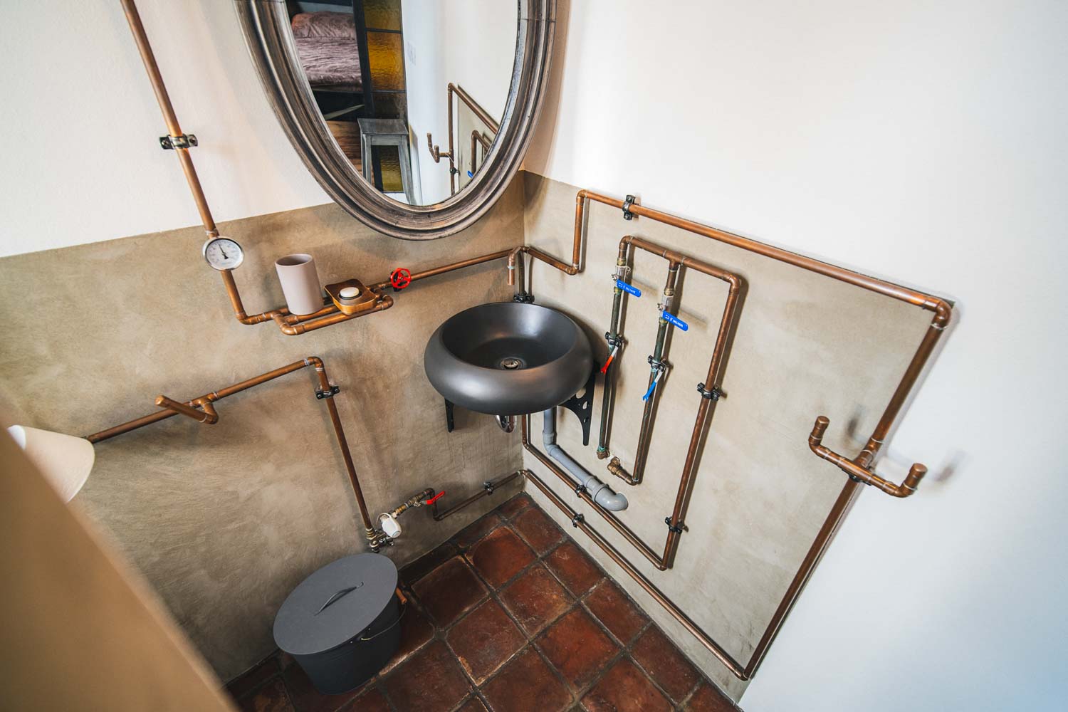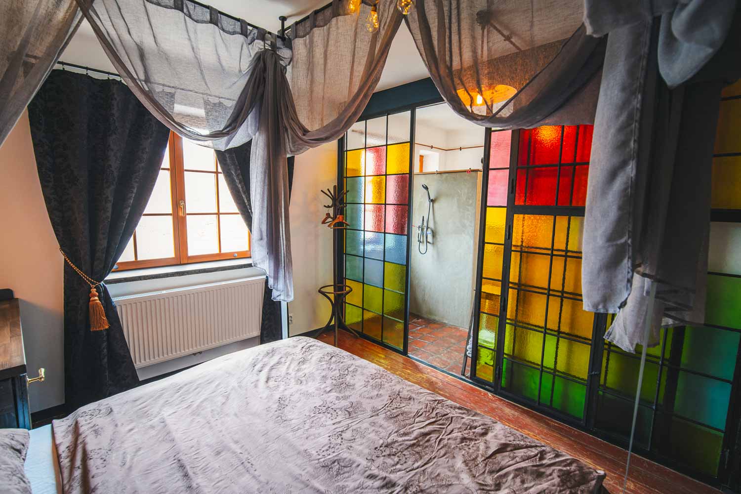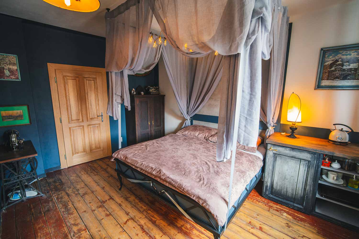Steampunkový pokoj je také dvoulůžkový, s manželskou postelí a vlastním sociálním zařízením (sprchový kout, umyvadlo a toaleta). K dispozici je kávový koutek s lednicí s malým mrazáčkem, rychlovarnou konvicí, french pressem, ručním mlýnkem a základním nádobím. Tento pokoj nemá dřez, ale je vybaven vším potřebným pro jednoduché občerstvení a pohodlný pobyt.