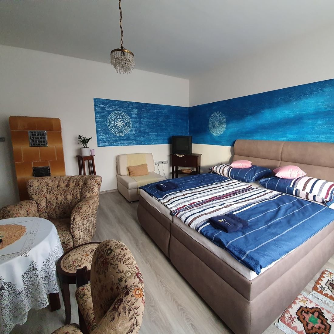 K dispozici je několik plně vybavených bytů a pokojů, které poskytují maximální komfort i soukromí. Hosté si mohou vybrat mezi ubytováním v hlavní budově nebo v samostatném Modrém domě – depandanci. Celková kapacita činí 41 osob v různých pokojích od dvoulůžkových až po čtyřlůžkové, což z ubytování činí ideální volbu jak pro jednotlivce, páry a rodiny, tak i větší skupiny přátel či firemní kolektivy. Pokoje i celé byty je možné pronajmout samostatně nebo jako celek.