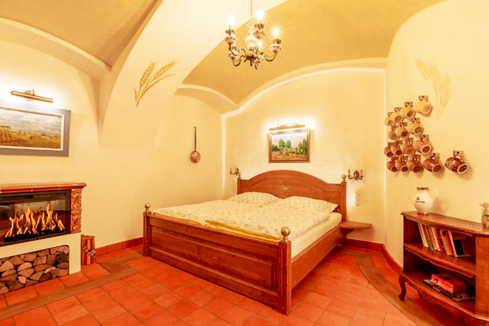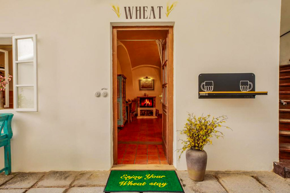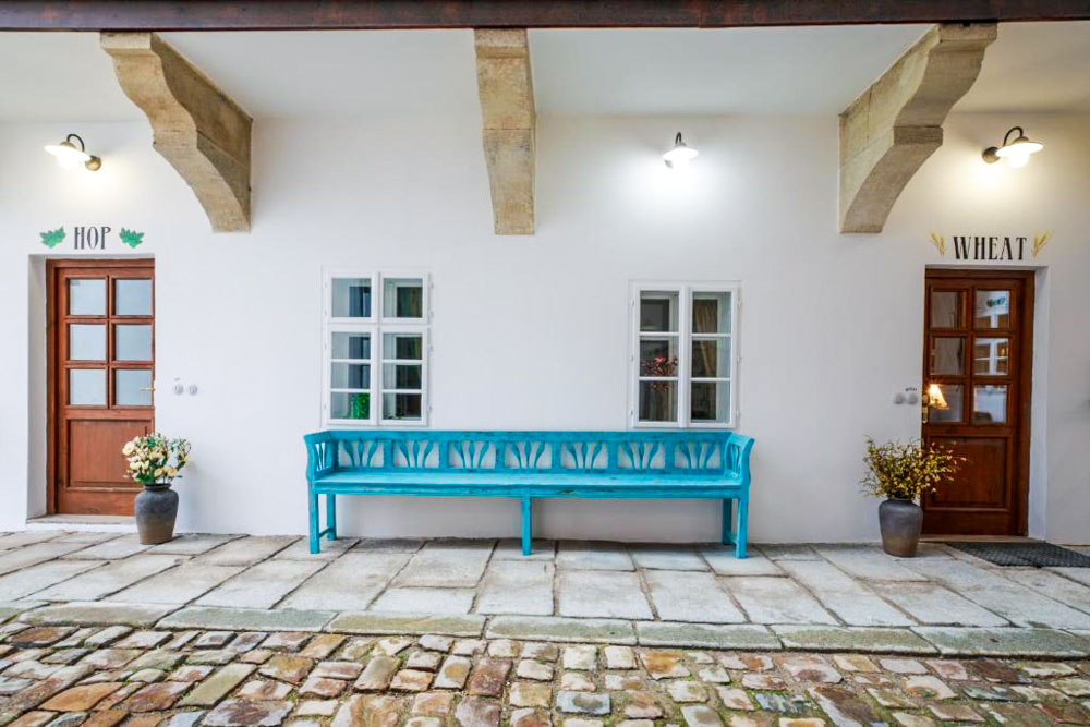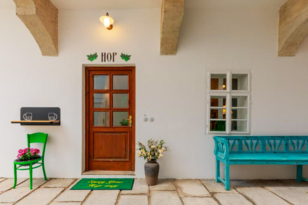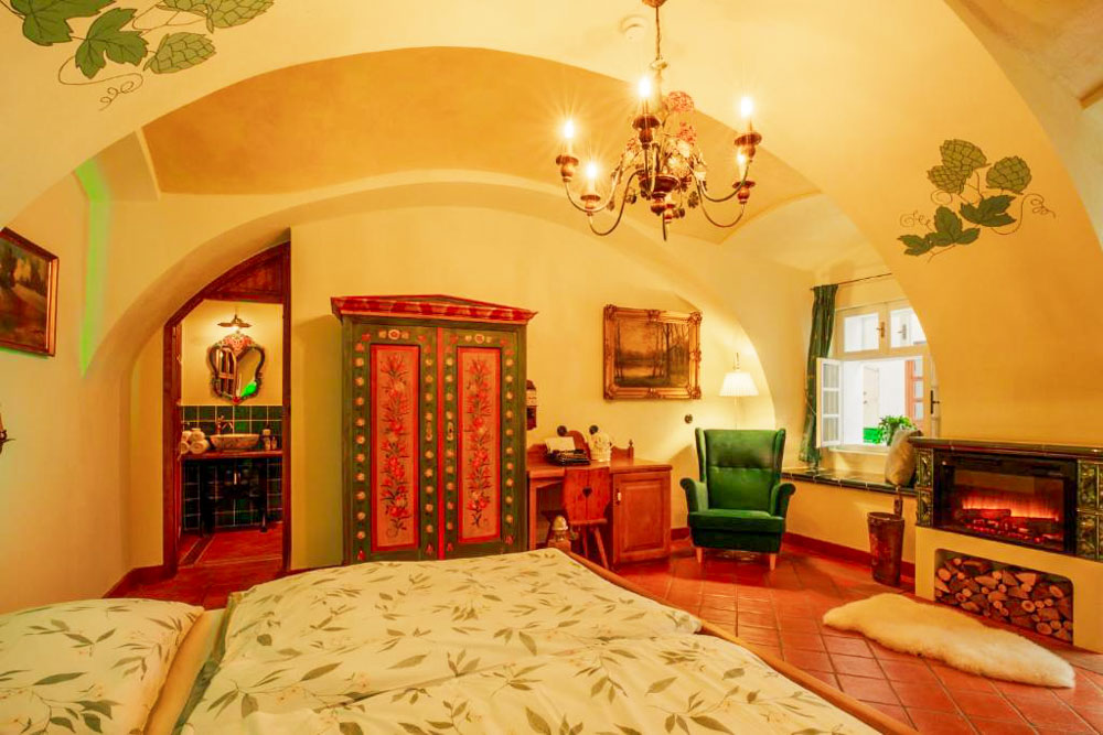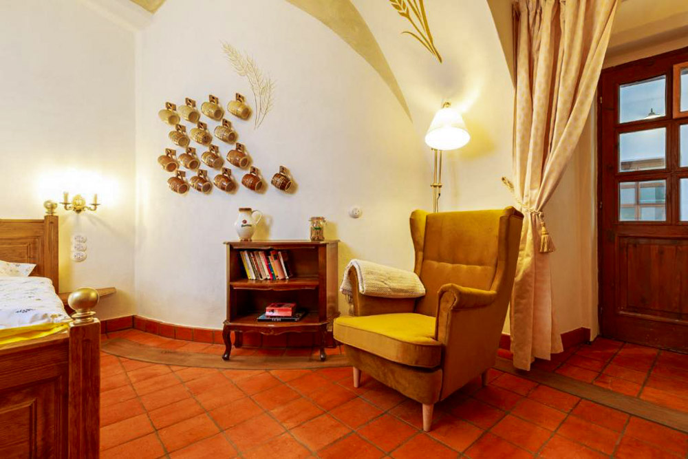 Pokoj Hop (24 m²) a pokoj Wheat (22 m²) jsou koncipované jako útulné dvoulůžkové pokoje s manželskou postelí king size, dřevěným nábytkem, ušákem na posezení a stylovou výzdobou s motivy chmele či pšenice; oba nabízejí minibar, Wi-Fi, sadu na přípravu kávy a čaje, sprchu, pivní kosmetiku, pantofle a starožitný psací stroj, přičemž Hop má vyhřívané posezení v parapetu a Wheat kachlový krb. Suite Barley (40 m²) tvoří ložnice a obývací pokoj s krbovými kamny, oddělitelnými závěsem, a je tak vhodný jak pro romantický pobyt ve dvou, tak pro až 4 osoby díky rozkládacímu sofa. Nabízí historickou dělenou postel, posezení s výhledem na nádvoří, minibar, Wi-Fi, sadu na přípravu kávy a čaje, sprchu, pivní kosmetiku, pantofle, gramofon, psací stroj a možnost posezení ve vnitrobloku; ve všech pokojích je součástí pobytu také džbánek točeného piva.