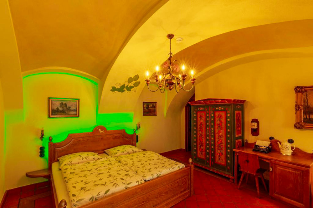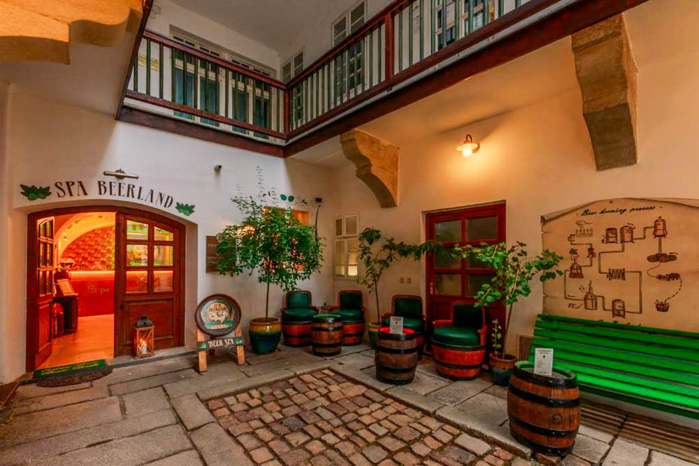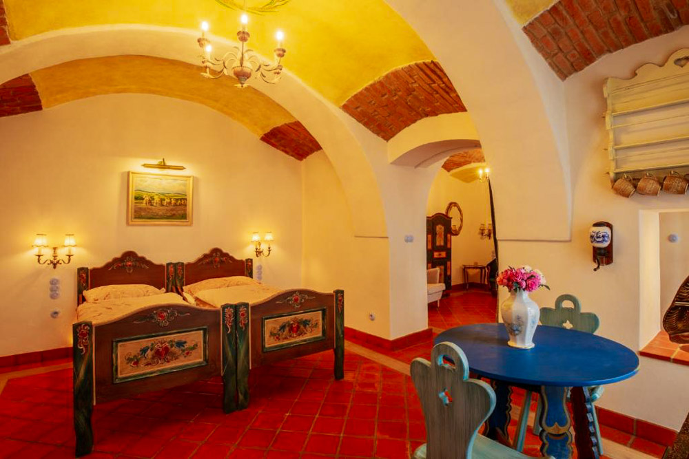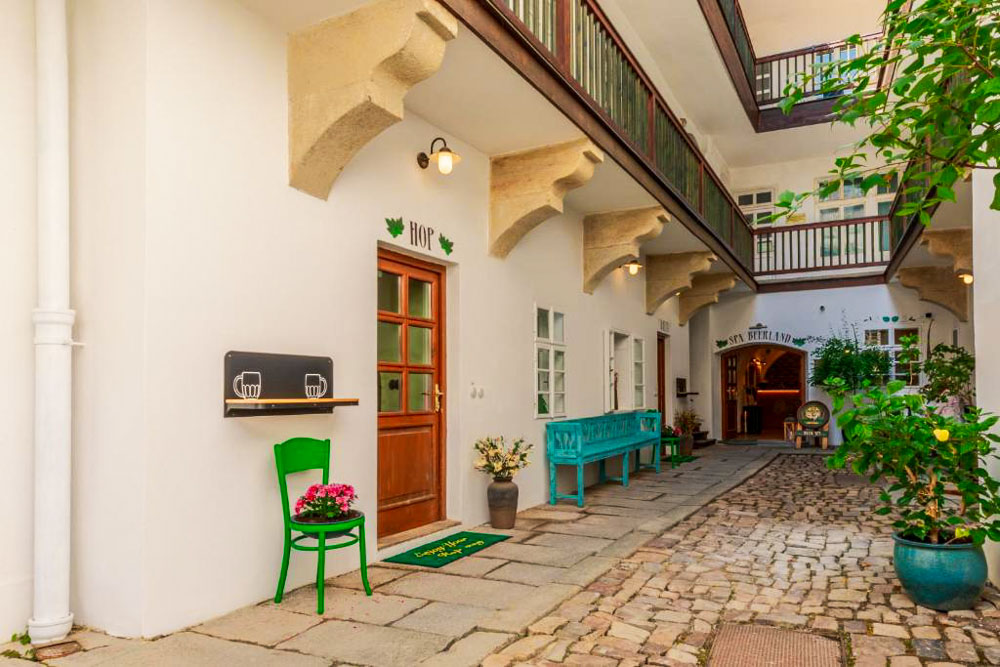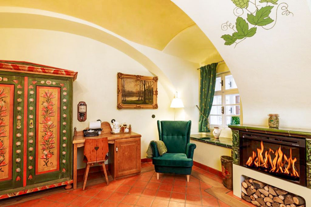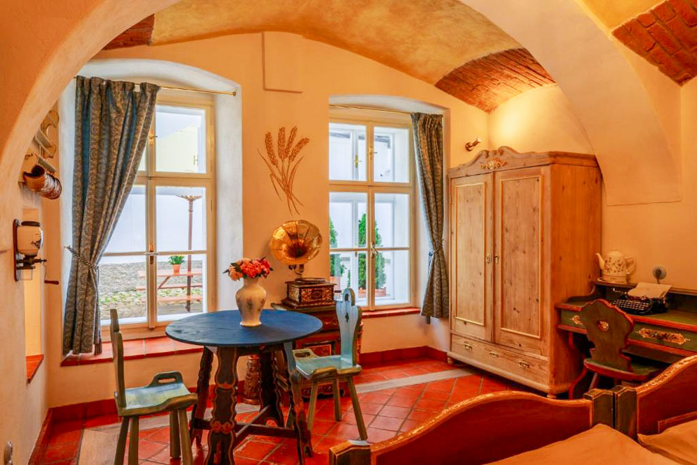 Pokoj Hop (24 m²) a pokoj Wheat (22 m²) jsou koncipované jako útulné dvoulůžkové pokoje s manželskou postelí king size, dřevěným nábytkem, ušákem na posezení a stylovou výzdobou s motivy chmele či pšenice; oba nabízejí minibar, Wi-Fi, sadu na přípravu kávy a čaje, sprchu, pivní kosmetiku, pantofle a starožitný psací stroj, přičemž Hop má vyhřívané posezení v parapetu a Wheat kachlový krb. Suite Barley (40 m²) tvoří ložnice a obývací pokoj s krbovými kamny, oddělitelnými závěsem, a je tak vhodný jak pro romantický pobyt ve dvou, tak pro až 4 osoby díky rozkládacímu sofa. Nabízí historickou dělenou postel, posezení s výhledem na nádvoří, minibar, Wi-Fi, sadu na přípravu kávy a čaje, sprchu, pivní kosmetiku, pantofle, gramofon, psací stroj a možnost posezení ve vnitrobloku; ve všech pokojích je součástí pobytu také džbánek točeného piva.