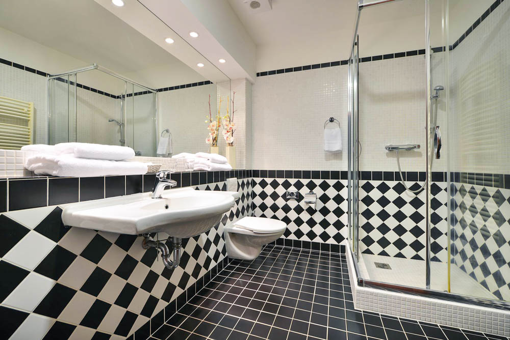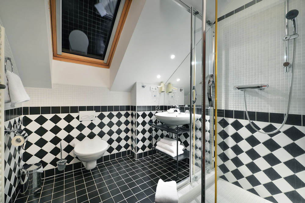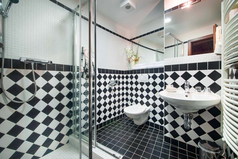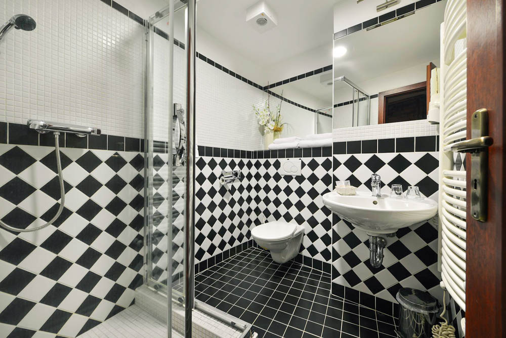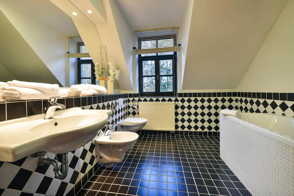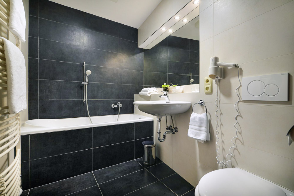 Všechny koupelny jsou prostorné a vybavené buď sprchovým koutem, nebo vanou, dle typu pokoje. Samozřejmostí je fén, kvalitní hotelová kosmetika, dostatek ručníků a bezplatné Wi-Fi připojení v celém objektu. Hosté mají přímý přístup do wellness centra Blue Spa, kde mohou relaxovat ve vířivce nebo sauně. Hotel je přátelský k pobytům s domácími mazlíčky a nabízí také zázemí pro pracovní pobyty včetně pracovních koutů v pokojích. Parkování je zajištěno přímo u hotelu, což ocení hosté přijíždějící s rodinou, golfovou výbavou nebo na delší pobyt.