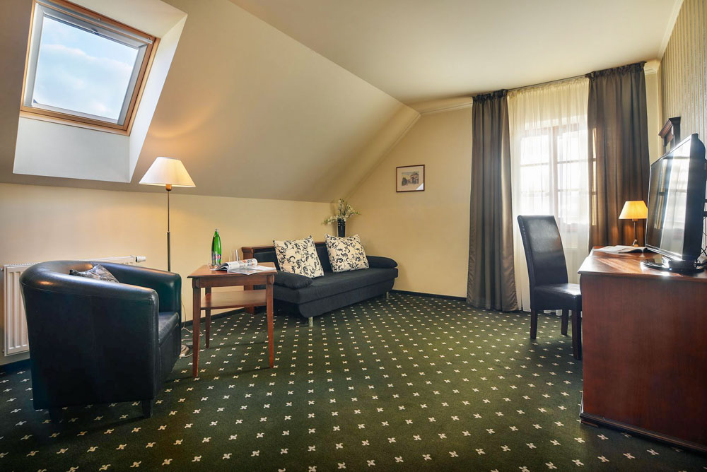 Náročnější hosté mohou zvolit Junior Suite, která nabízí komfortní ubytování s postelí velikosti King Size a možností přistýlky. Vybrané suity jsou doplněny o venkovní terasu, která rozšiřuje obytný prostor a umožňuje klidný odpočinek na čerstvém vzduchu.