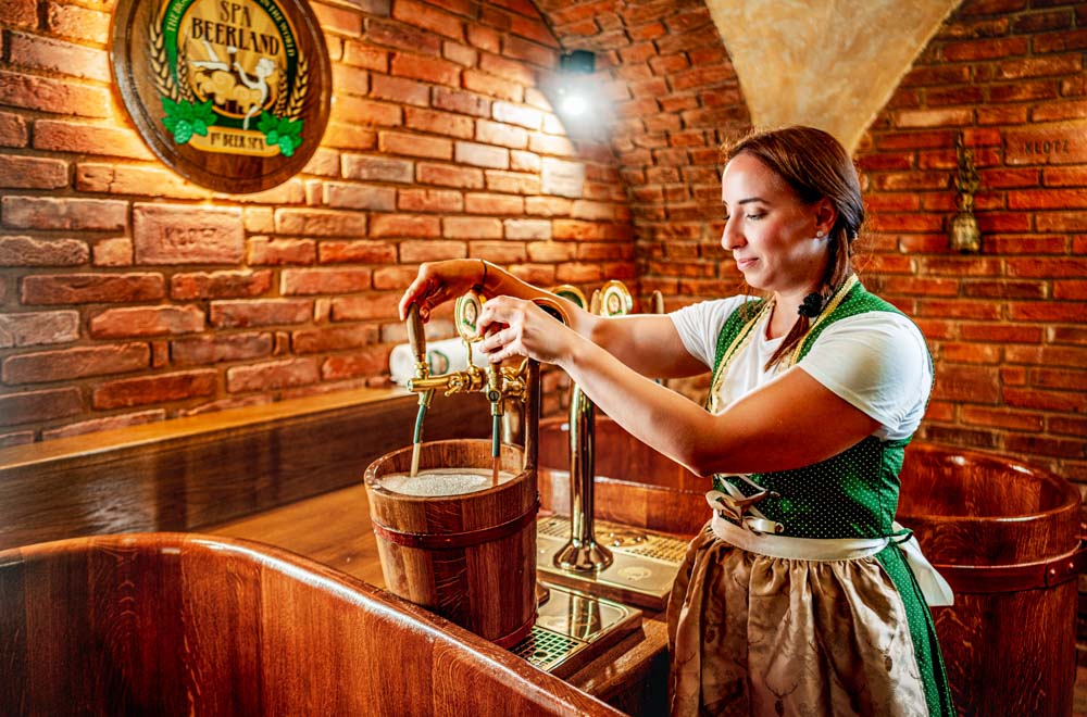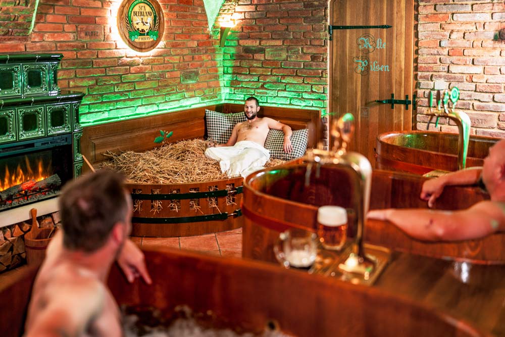 Během koupele si sami čepujete neomezené množství světlého i tmavého piva přímo u kádě. Pivní extrakty a kvasnice s obsahem vitamínu B podporují regeneraci pokožky, uvolnění těla i celkové zklidnění. Po koupeli následuje odpočinek na lůžku z pravé pšeničné bio slámy, kde se účinky procedury přirozeně vstřebávají. Atmosféru doplňují rozpálená kachlová kamna a čerstvý domácí pivní chléb. Celý zážitek propojuje staročeské lázeňské postupy, autentické historické prostředí a poctivý pivní rituál.