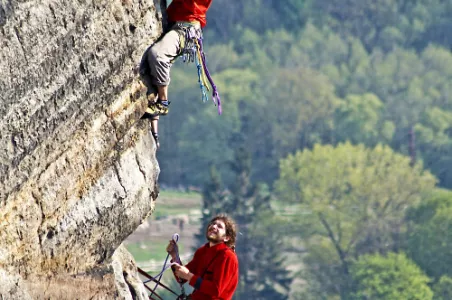 1. den: po setkání s instruktorem a přesunu do skal Vás seznámíme s materiálem, horolezeckým vybavením a jeho správným používáním. Naučíme Vás jak se navázat, vyzkoušíte si základy jištění a slaňování, které je nezbytné pro sestup z věže. Seznámíme Vás též se specifiky pískovcového lezení, ať již se jedná o speciální techniky lezení nebo jištění. Po základní instruktáží již sami zkusíte pohyb do vertikálního světa.. Jelikož polezete na „správném konci lana“, nehrozí Vám žádný pád.. Po celou dobu budete jištěni zkušeným instruktorem.. Po zdolání stěny spočinete na malebném vrcholu pískovcové věže..
